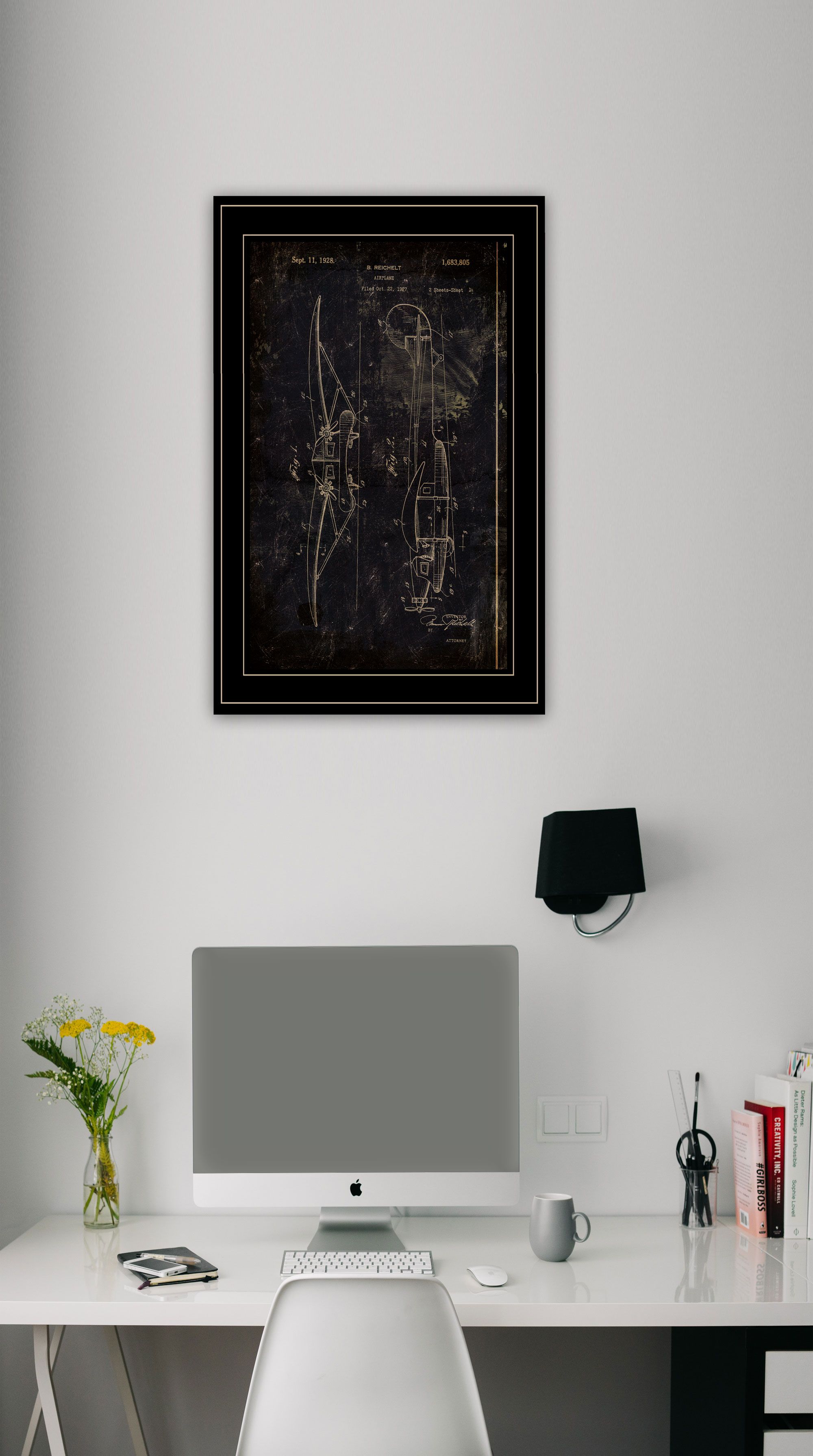 "Airplane Patent" is a 15"x19" framed print by artist Cloverfield & Co. This decorative black framed vignette sketches of a bi-airplane will be the delight of any airplane lover. Prints are UV coated (glass is not needed) and arrives ready to hang.•TEXTURED ARTWORK with a 'rolled on' acid-free acrylic coating to create a canvas painting effect.•UV PROTECTANT COATING protects artwork from fading. No glass is necessary.• MOULDING adds natural beauty to the framed art. Frame is keyholed for the easy hanging.•THIS FINE HOME DECOR piece made in the USA by Woman Owned Business (WBE) is a perfect gift for a friend or relative.