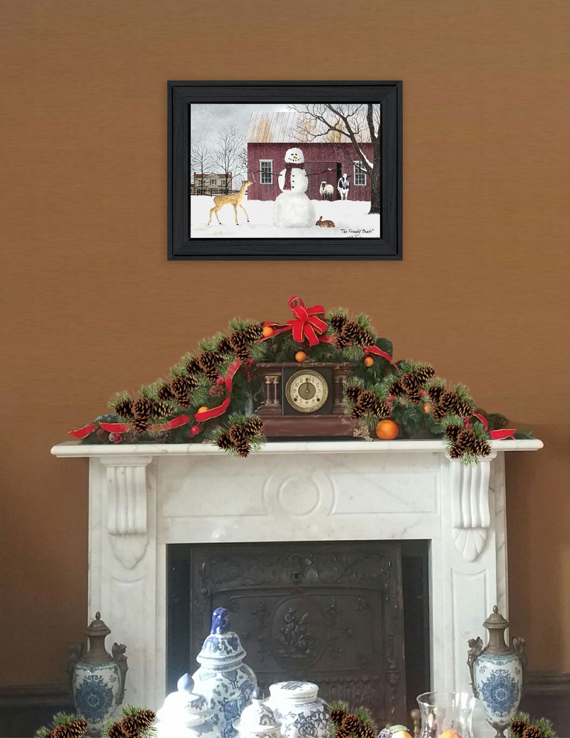 BJ1120-405 "The Friendly Beasts" by Billy Jacobs is a black framed print size 19x15 of snowman with wooden arms and carrot nose, deer is after the peppermint candy cane that is being, held by the snowman, the cow and sheep are watching the deer. No one notices the rabbit on the other side of the snowman. The setting is a homestead of the Amish. Talk about a lot of snow! The surface of the print is textured with a fade resistant coating so no glass is necessary. Arrives ready to hang. Made in the USA by skilled American workers. •Textured Artwork with a 'rolled on' acid free acrylic coating to create a canvas painting effect. No glass is necessary.•Surface of the print has a fade resistant coating.•Arrives Ready to Hang•Woman Owned Business (WBE)•Handmade in the USA•Decorative Moulding adds natural beauty to the framed art.