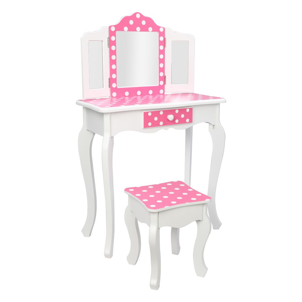 This is a children's dresser with curved feet and three-fold mirrors. This dresser is made of high quality MDF board, its  elegant round bronzed handle accentuates the super quality of the dressing table. Red dots and white make this dresser sweet and lovely. The dresser top and stool surface all adopt arc design for avoid children knock against to cause unnecessary injury. The three-fold mirror can be detachable and used as a children's desk.