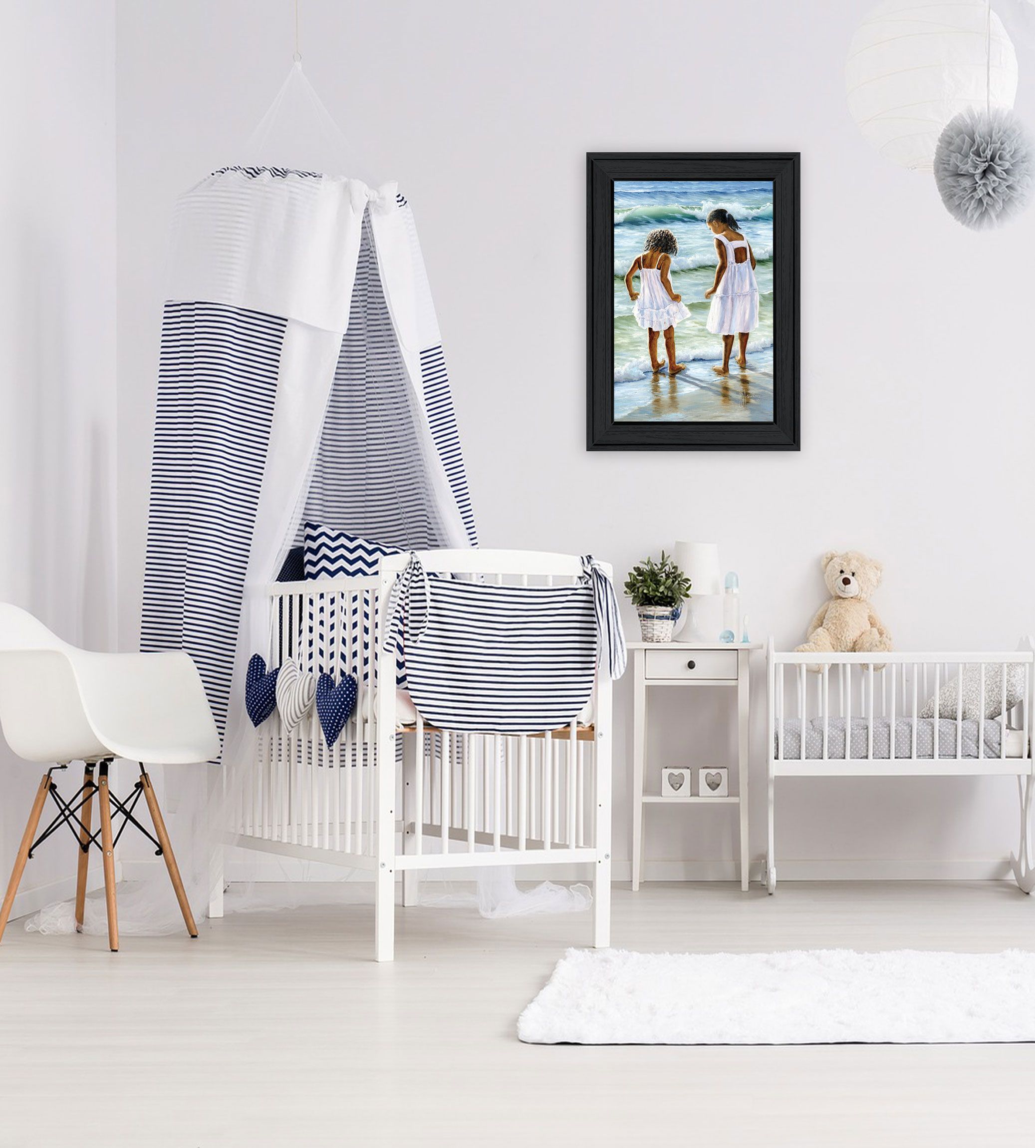 JAN224-405 "Two Girls at the Beach" is a 11x15 black framed print by artist Georgia Janisse. This artwork features two small black girls getting their feet wet in the ocean, playing with the waves coming in and out. This totally American Made wall decor item features an attractive frame, a textured canvas like finish so no glass is necessary and is ready to hang. •Textured Artwork with a 'rolled on' acid free acrylic coating to create a canvas painting effect. No glass is necessary.•Surface of the print has a fade resistant coating.•Arrives Ready to Hang•Woman Owned Business (WBE)•Handmade in the USA•Decorative Moulding adds natural beauty to the framed art.