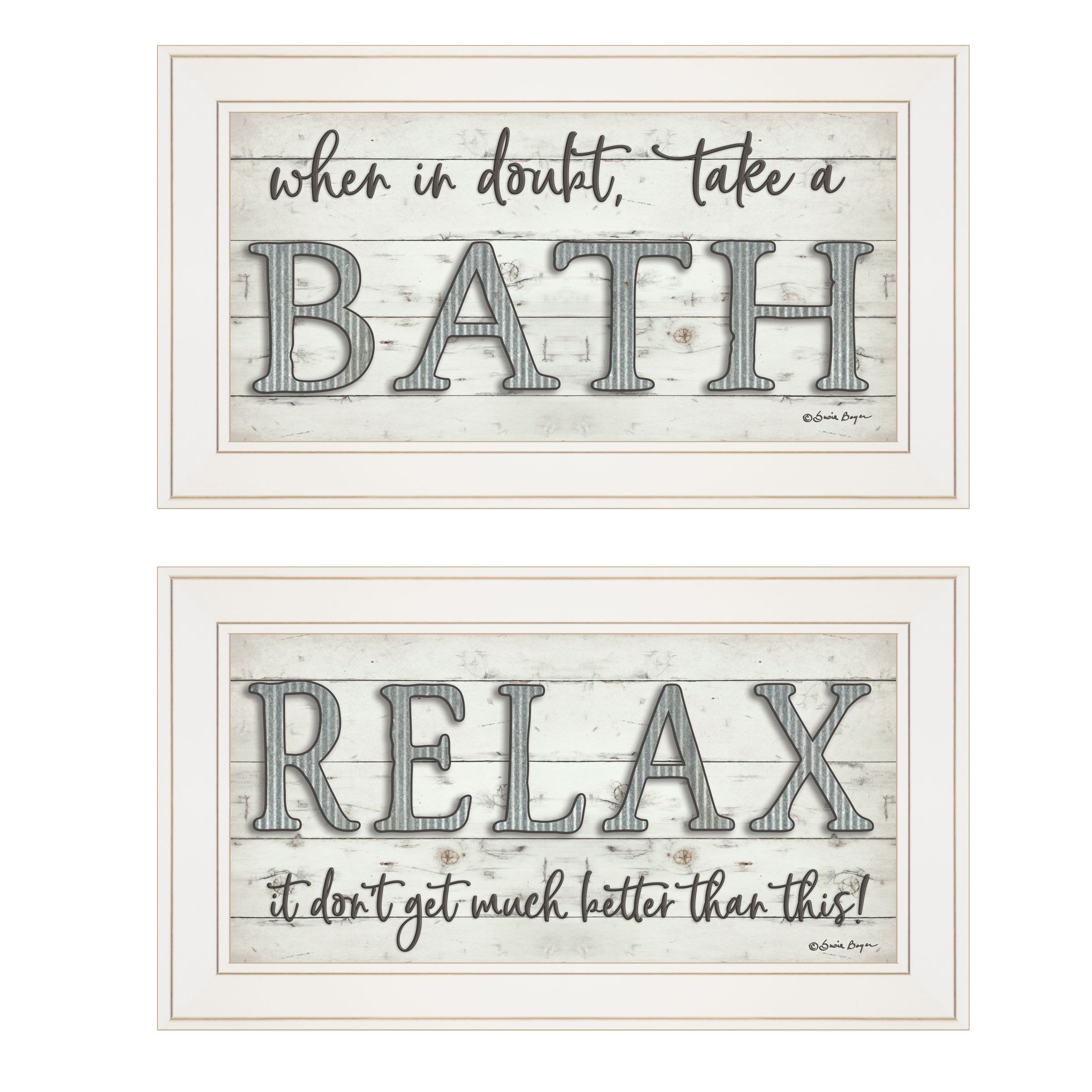 "Bathe/Relax" by artisan Susie Boyer. This decorative white framed 2-pc (21x12) Collection of prints for the bathroom: When in doubt, take a Bath! along with the other print Relax -it don't get much better than this! Crafted by skilled American crafters and coated with a fade-resistant texture, this piece has a canvas-like appearance that will last for years to come. Invest in a piece that is truly one-of-a-kind.•Transform your walls with this stunning piece of art and bring a touch of modern elegance to your room. This stunning piece will not only add visual interest to any room but it's minimalist design will bring a sense of serenity to your space.•Tired of dull, empty walls in your home? We believe that walls should inspire, not bore. That's why we offer a wide range of wall art to suit any space from bedroom and kitchens to office and beyond. Give your walls a facelift with our printed arts and transform your space into a stylish and inviting home.•This framed wall art is hand-crafted in the USA of high-quality wood with the surface of the art coated with a fade-resistant texture which gives it a canvas-like appearance for many years of enjoyment in your home.•Bring a pop of colour and style to any room with our fully assembled and ready-to-hang wall art. With a wide selection of decorative pieces to choose from, you'll easily find the perfect match for your personal taste or to give as a thoughtful gift. Don't miss out on the opportunity to add some unique charm to your space.•Experience the unmatched quality and durability of American-made craftsmanship with this individually hand-crafted wall decoration art. Skilled crafters put their expertise into every piece to ensure it will stand test of time and bless your eyes for years to come.