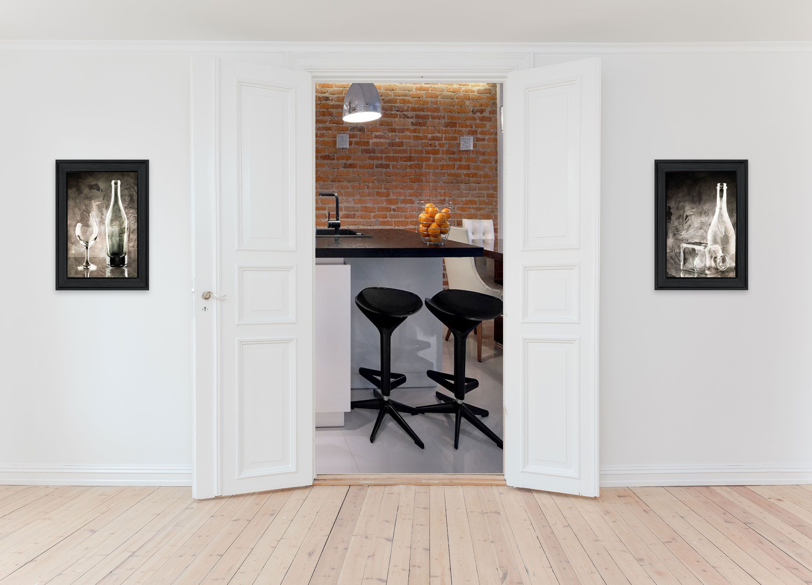 V593-405 "Moody Gray Glassware Still Life" Vignette by artisans Bluebird. Vignette framed in a decorative black frame; 2-piece (15x19 ea.)vignette of wine bottles with black and white still life. The surface of the print is textured with a fade resistant coating so no glass is necessary. Arrives ready to hang. Made in the USA by skilled American workers. •Print has fade resistant surface texture, no glass is necessary•Woman Owned Busines (WBE)•Arrives ready to hang, no additional hardware needed on item•individually hand crafted by skilled American workers•Decorative grouping in matching frames